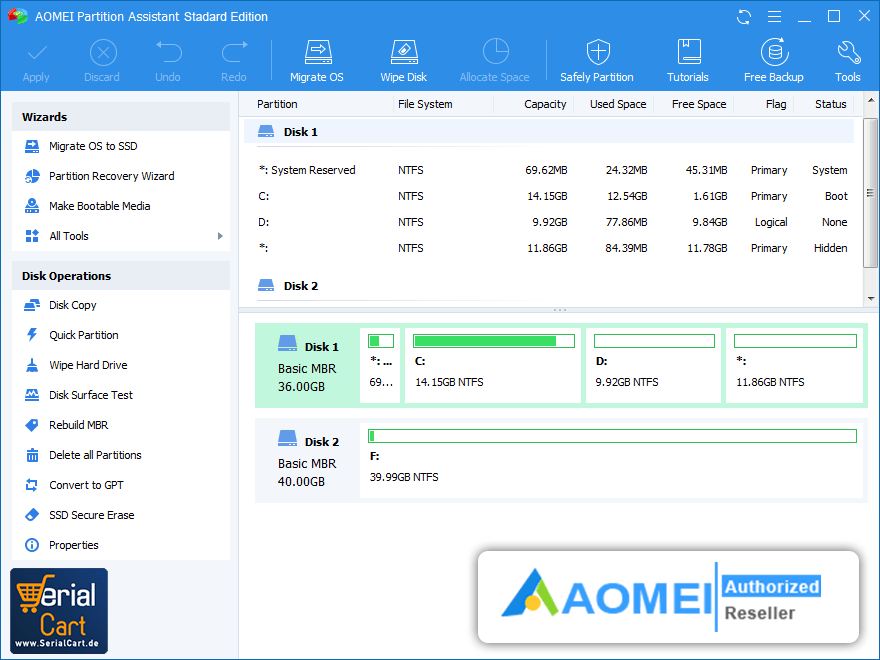 AOMEI Partition Assistant contains more than 30 valuable functions to optimize your hard disk partition performance. It can fix the low disk space problem, solve the irrational disk partition problem and repartition a hard disk without data loss. In a word, it can manage your hard disks and partitions in the most reasonable way.