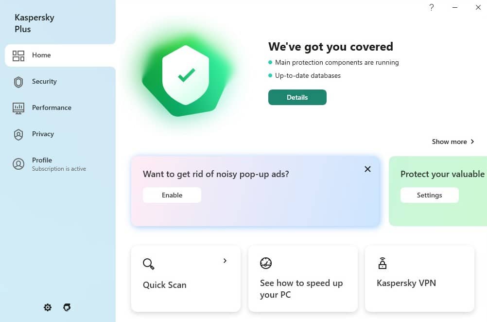 Kaspersky Plus protects your devices and data around the clock. It blocks common and complex threats such as viruses, malware, ransomware, spy apps and all the latest hacker tricks.